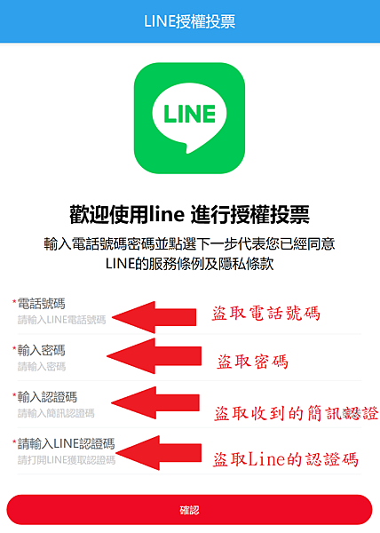當你四項都KEY好...按下確認後,你的Line帳號馬上就會被盜用了....盜用集團已經在遠端,用你提供的資料,登入你的Line了...